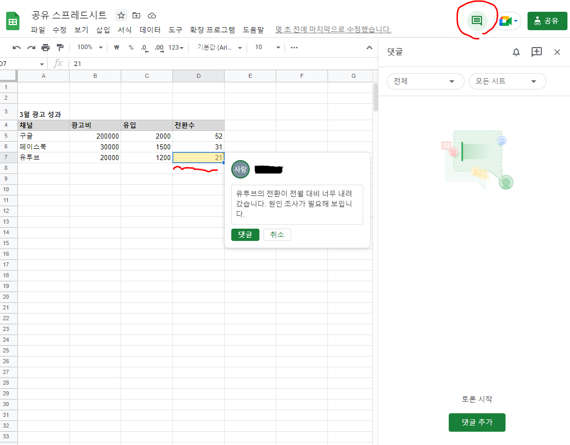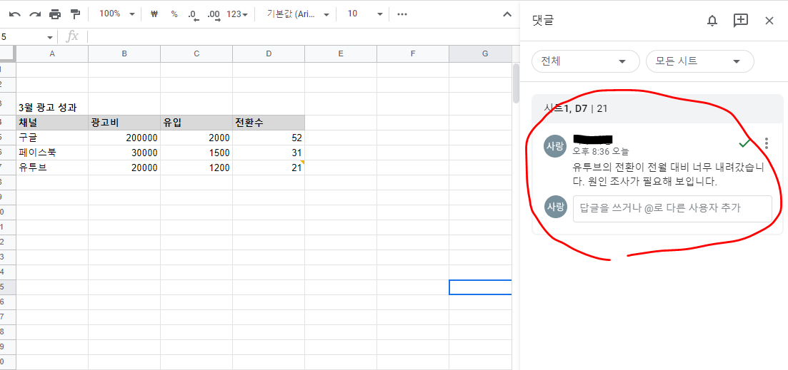위의 제가 간단히 만든 공유문서는 특정 월의 채널별 광고비와 유입을 표시한 문서입니다. 이 문서에서 만약 특정 지표가 잘못되었다면 그 숫자를 찍고 댓글을 추가할 수 있습니다.
