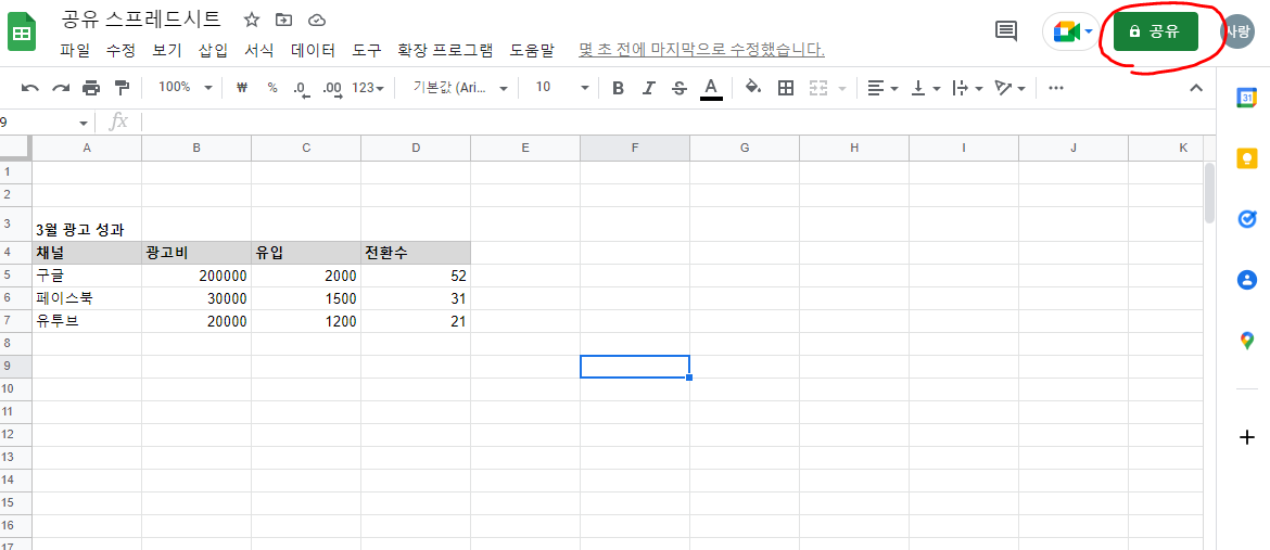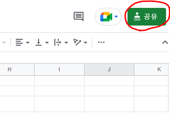 간단하게 스프레드시트를 만들면, 우측 상단에 녹색의 공유 버튼이 보입니다. 이 버튼을 클릭하면 공유가 가능합니다.