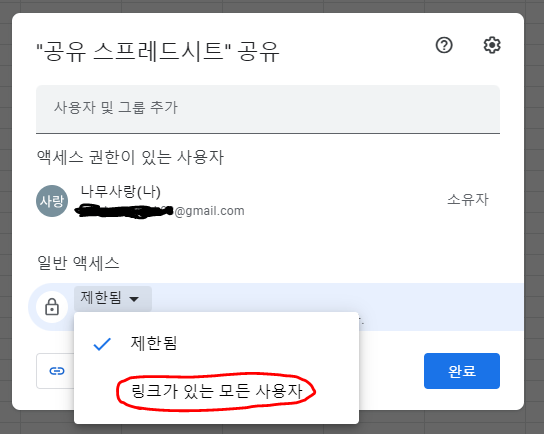 공유 옵션을 원하는데로 설정하고, 마지막에 완료 버튼을 누르면 공유 설정이 활성화 됩니다.