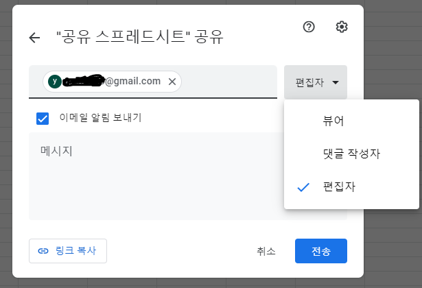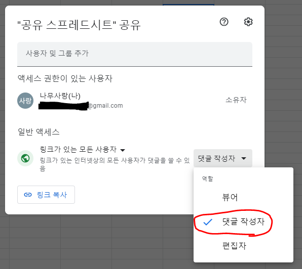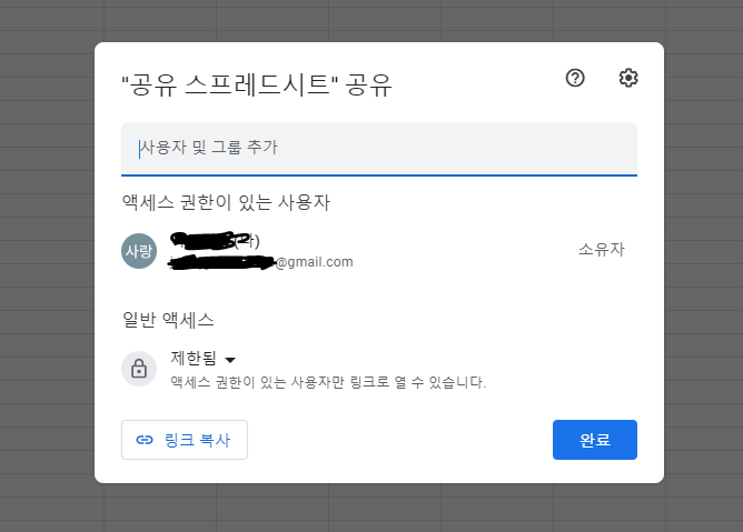 공유 버튼을 클릭하면 아래와 같이 액세스 권한을 설정할 수 있습니다.