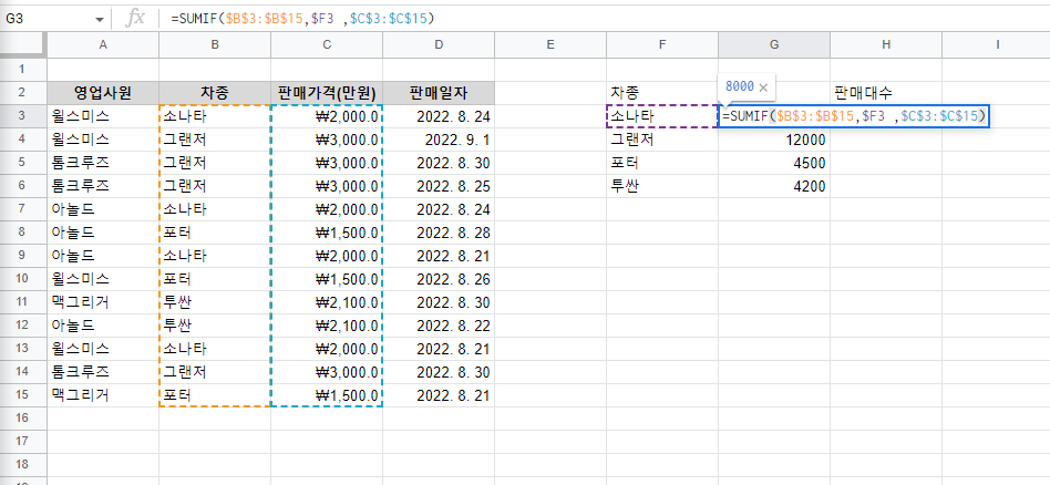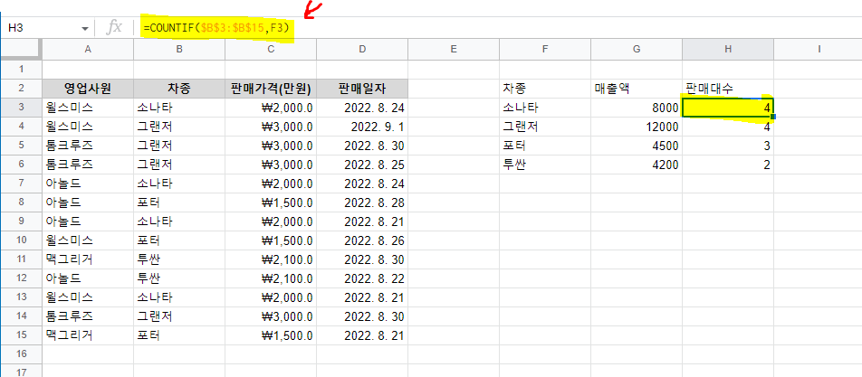 위 SUMIF 예시에 차종별 판매대수를 H3에 구한 예제입니다.