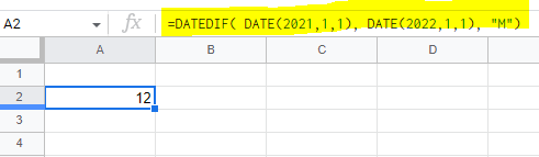 =DATEDIF( DATE(2021,1,1), DATE(2022,1,1), "M")