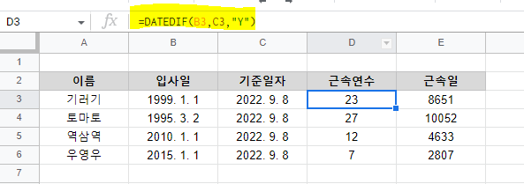 구글스프레드시트 - DATEDIF