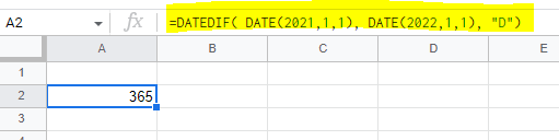=DATEDIF( DATE(2021,1,1), DATE(2022,1,1), "D")위와 같이 입력하면, 365일이 표시됨을 알 수 있습니다.