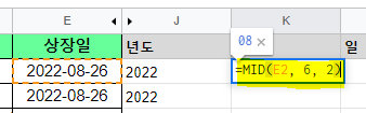 '-' 도 문자수에 포함되기 때문에 MID(E2, 6, 2) 로 월을 분리합니다.