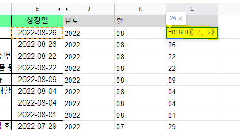 "YYYY-MM-DD" 형식에서는 뒤의 두자리가가 일자를 의미하여, RIGHT(E2, 2) 로 일자를 분리합니다.
