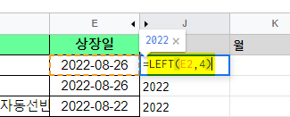 "YYYY-MM-DD" 형식에서는 앞의 네 자리가 년도를 의미하여, LEFT(E2, 4) 로 년도를 분리합니다.