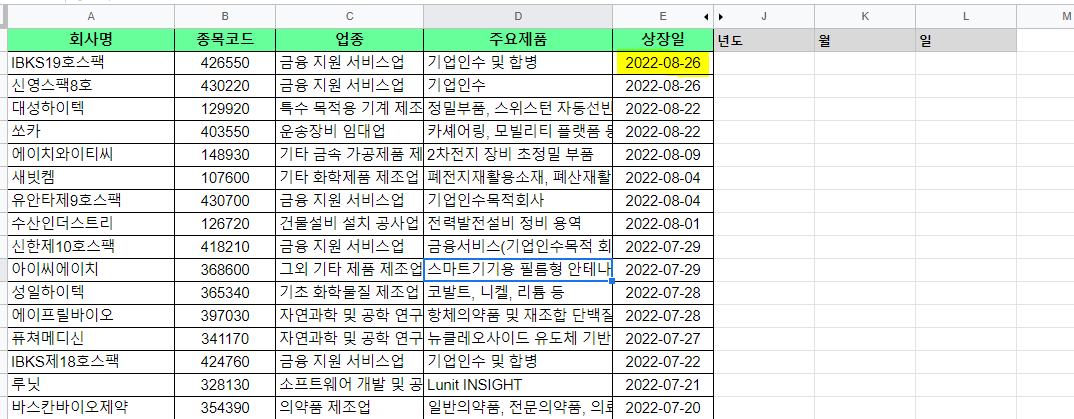 시트1 회사명,종목코드,업종,주요제품,상장일,결산월,대표자명,홈페이지,지역,년도,월,일 IBKS19호스팩,426550,금융 지원 서비스업,기업인수 및 합병,2022-08-26,12월,임세광,<a href="http://www.ibks.com">http:/