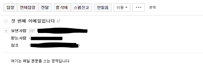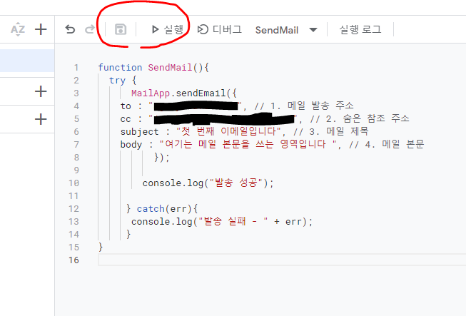function SendMail(){ try { MailApp.sendEmail({ to : "email address", // 1. 메일 발송 주소 cc : "cc email addr", // 2. 숨은 참조 주소 subject : "첫 번째 이메일입니다", // 3. 메일 제목 body : "여기는 메일 본문을 쓰는 영역입니다 ", // 4. 메일 본문 }); console.log("발송 성공"); } catch(err){ console.log("발송 실패 - " + err); } }이제 앱스 스크립트에 위의 코드를 추가하여 메일을 발송해 보겠다. 위 코드는 발송주소 to, 참조 주소 cc에 임의의 값을 넣었기 때문에, 복사하더라도 실제 발송할 이메일 주소로 직접 수정하기를 바란다.