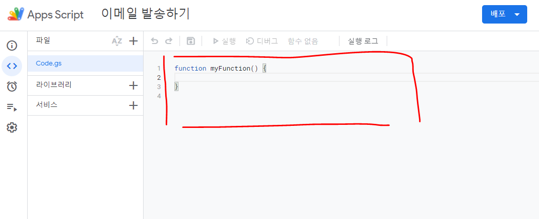 Apps script 실행 위치 위 메뉴를 실행하면 앱스 스크립트를 편집하고 배포할 수 있는 화면이 나온다. 가운데 붉은 박스로 표시한 부분이 앱스 스크립트를 편집할 수 있는 영역이다.