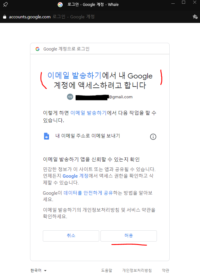 이메일 보내기의 경우 최초 실행 시점에 이메일 발송 권한을 체크해야 한다. 아래 팝업이 나오는데 허용을 해주면 됩니다.