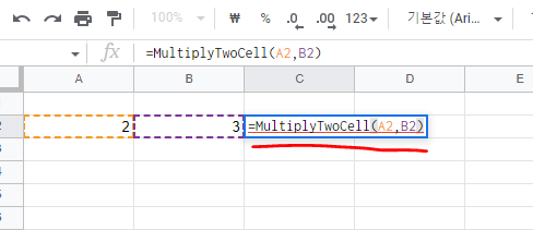 스프레드시트에서 MultiplyTwoCell 함수를 이용해 보겠습니다.