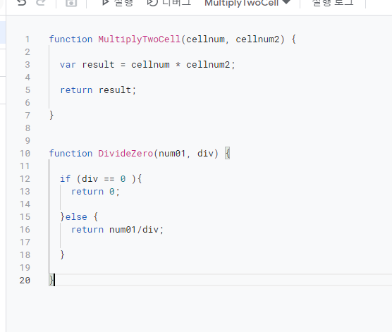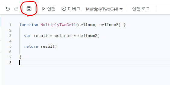 function MultiplyTwoCell(cellnum, cellnum2) { var result = cellnum * cellnum2; return result; }위의 코드를 Apps Script 편집화면에 추가합니다.