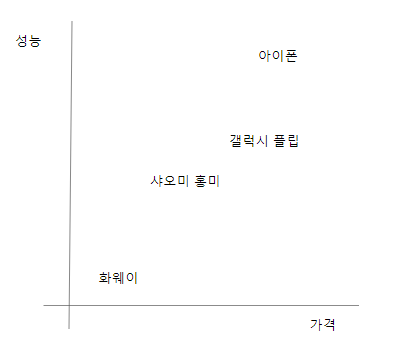 예를 들어, 스마트폰 시장에서 어떤 브랜드가 안정적인 성능과 고급스러운 디자인을 제공한다면, 해당 브랜드는 포지셔닝 맵에서 성능과 디자인의 좌측 상단에 위치할 것입니다. 이와 반대로, 가격이 낮고 기능이 제한적인 제품은 우측 하단에 위치하게 됩니다. 허접하지만, 성능과 가격을 기준으로 포지셔닝 맵을 그린다면 아래 정도이겠죠. (절대 좋은 사례는 아니며 참고만 부탁드립니다. )