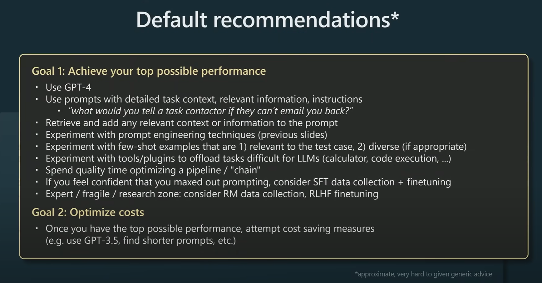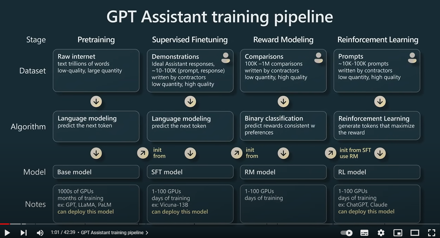 - 다양한 출처의 데이터로 학습된 Base model은 assitant가 아닙니다. SFT, RM, RL 들의 다양한 방법으로 튜닝되어야 합니다.