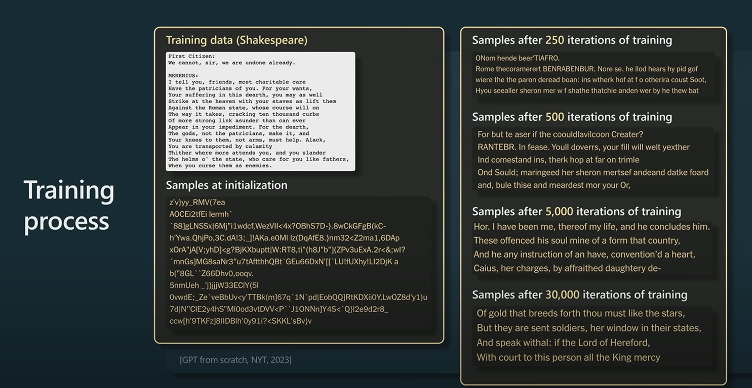 - 뉴욕타임즈에서 실험한 내용을 공유합니다. 반복적인 학습으로 트랜스포머 가중치 업데이트를 통해서, 모델은 시간이 지남에 따라 일관성을 갖게 됩니다. 위 장표와 같이 이터레이션이 반복되면서, 괜찮은 문장을 생성해 내고 있습니다. 상당히 신기하네요...