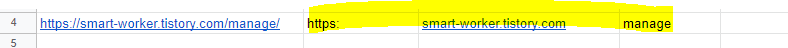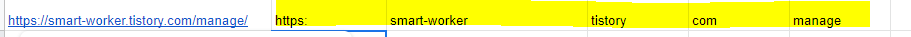 SPLIT("https://smart-worker.tistory.com/manage/", "/")위 함수는 블로그 주소를 "/" 를 기준으로 분할합니다.