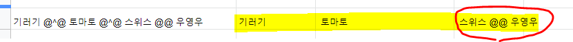 세번째 옵션을 FALSE로 설정하면 됩니다.SPLIT("기러기 @^@ 토마토 @^@ 스위스 @@ 우영우", "@^@", FALSE)"@^@"와 완전히 일치하는 문자만 분리하기 때문에, 마지막에 "스위스@@우영우"는 분리되지 않았습니다.