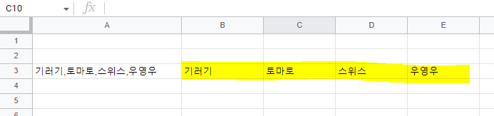 아래 노란색 부분이 구글 스프레드 시트에서 SPLIT 함수를 적용한 결과 입니다.