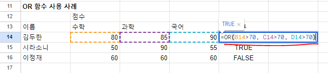 이번에도 비슷한 사례를 들어보겠습니다. 지난 번에 시험에서 모두 다 불합격하여, 이제 기준을 변경했습니다. 단 하나라도 80점 이상이라면 시험을 통과해주기로 결정했습니다. 이 때 OR 함수를 이용해 합격 여부를 가릴 수 있습니다.