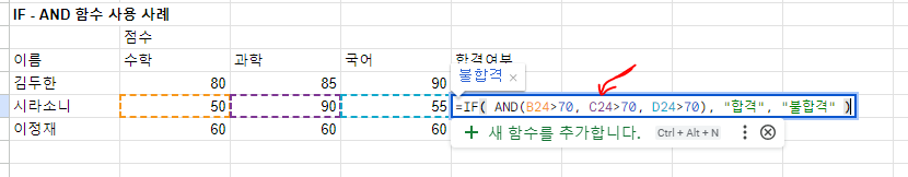 시트1 AND 함수 사용 사례 점수 이름,수학,과학,국어,합격여부 김두한,80,85,90 시라소니,50,90,55 이정재,60,60,60 OR 함수 사용 사례 점수 이름,수학,과학,국어,합격여부 김두한,80,85,90 시라소니,50,90,55