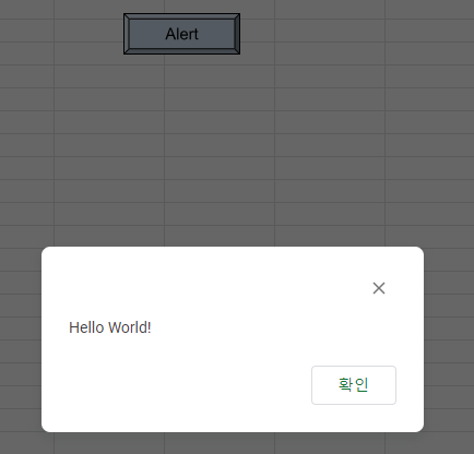 function openAlert(){ SpreadsheetApp.getUi().alert("Hello World!"); Logger.log("Call OpenAlert"); }이제 위 openAlert 함수를 구글 스프레드 시트에 생성한 버튼과 연결 시켜보겠습니다.