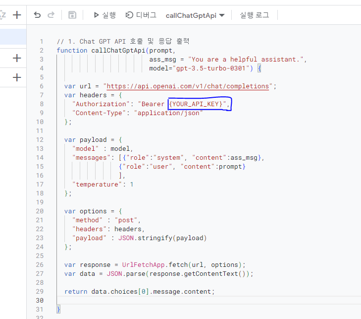 Apps Script에서 chatGPT API 호출 코드 작성하기