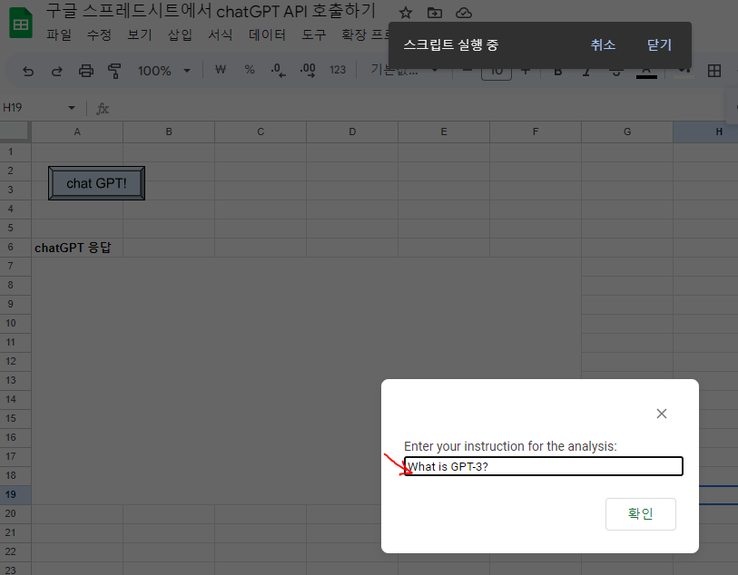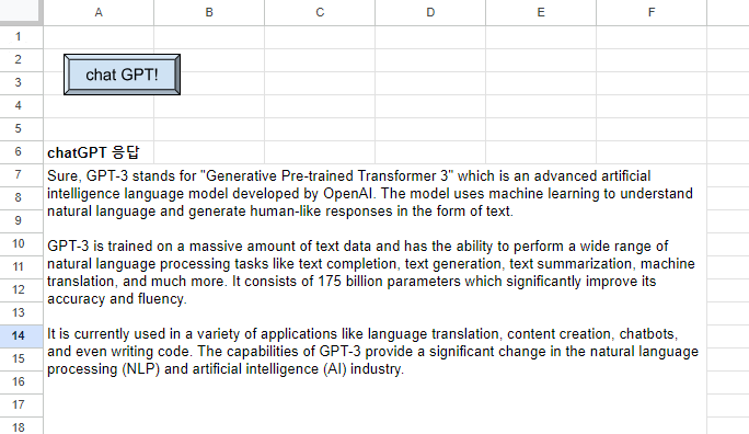 이 두 가지를 이용해서, 버튼 클릭 시 A7셀에 복사하는 코드입니다.// 2. 사용자에게 표의 분석내용에 대한 instruction을 받는 기능. function getInputFromUser() { var ui = SpreadsheetApp.getUi(); var response = ui.prompt('Enter your instruction for the analysis:'); if (response.getSelectedButton() == ui.Button.OK) { var resp = response.getResponseText(); Logger.log('The user\'s inst is %s.', resp); return resp; } else { Logger.log('The user clicked the close button in the dialog\'s title bar.'); return null; } } // 3. 1~2의 결과를 A7 셀에 복사하는 코드 function analyseSpreadsheetDataWithGpt() { var user_instruction = getInputFromUser(); if (user_instruction) { var prompt = user_instruction; // 1의 GPT API를 호출합니다. var response = callChatGptApi(prompt); Logger.log("chatGPT Response -----------"); Logger.log(response); // 응답을 'Sheet1'의 A7 셀에 씁니다. var outputSheet = SpreadsheetApp.getActiveSpreadsheet().getSheetByName('Sheet1'); var outputCell = outputSheet.getRange('A7'); outputCell.setValue(response); } }특정 버튼과 apps script의 함수를 연결하는 방법은 아래 글에서 다뤘습니다. 참고하세요