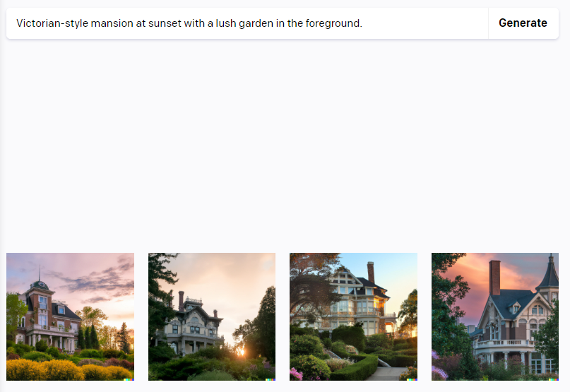 이 명령어는 AI에게 명확한 스타일(Victorian-style), 구체적인 시간(해질녘), 장소(정원이 있는 저택)에 대한 정보를 제공합니다. 이로써 AI는 해당 디테일을 바탕으로 이미지를 생성합니다.