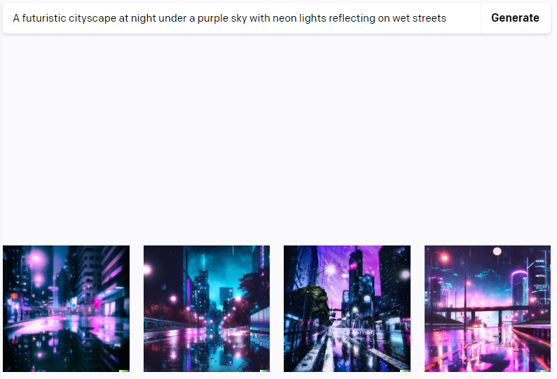 이 명령어는 AI에게 특정한 시간(밤), 색상(보라색 하늘, 네온 빛), 그리고 추가적인 요소(빗길에 반사되는 네온 빛) 등을 통해 미래적인 도시 풍경을 그려달라는 지시를 제공합니다.