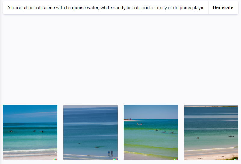 이 명령어는 AI에게 특정 장소(해변), 색상(청록색 물, 하얀 모래), 그리고 원하는 요소(놀고 있는 돌고래 가족) 등을 통해 아름다운 해변 풍경을 그려달라는 지시를 제공합니다.