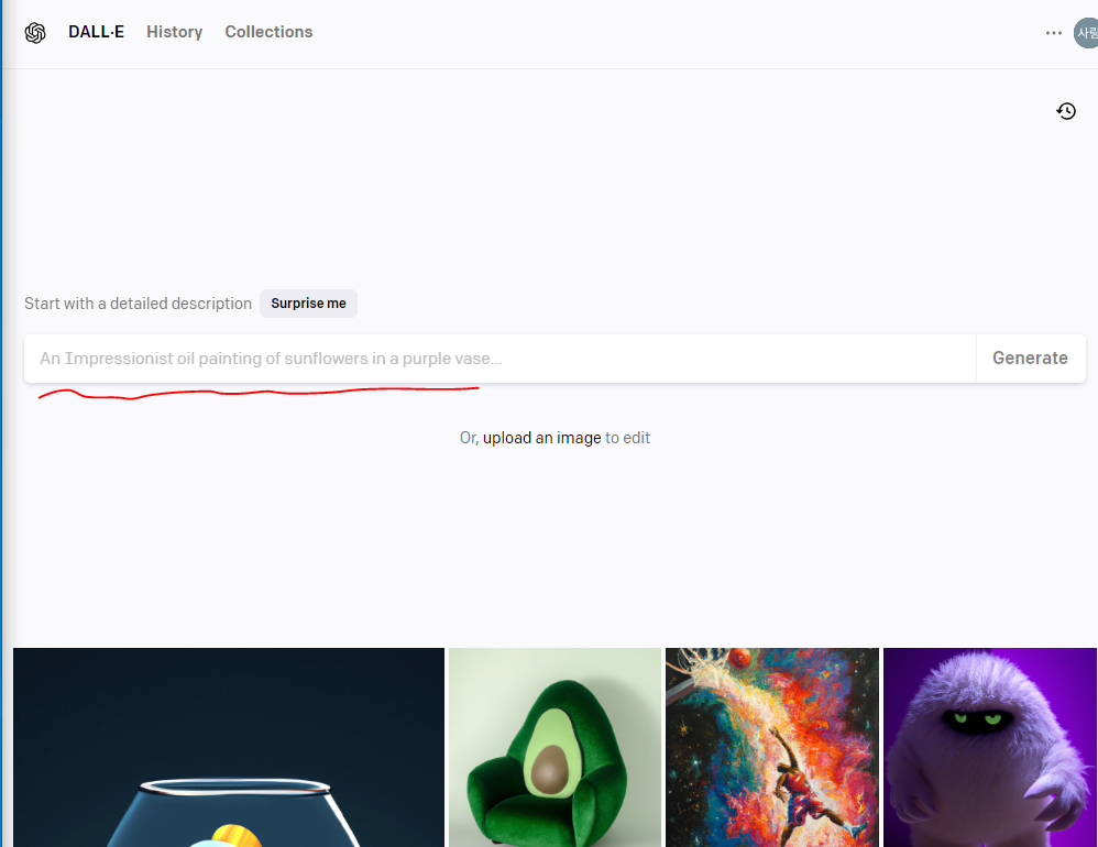 간단한 가입 절차를 거치면, 아래 Dall-E 페이지로 접근할 수 있습니다.