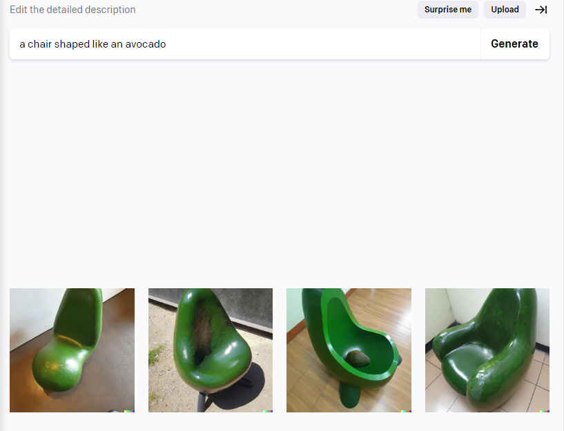 안타까운 점은 이미지 생성 명령 prompt를 영어로 입력해야 한다는 점입니다. 하지만, 간단한 구글링을 통해서 많은 예제를 찾을 수 있으니, 이미지 prompt 만드는 것이 어렵지는 않을 것입니다.예를 들어, "a chair shaped like an avocado"라는 문구를 입력해 보겠습니다.