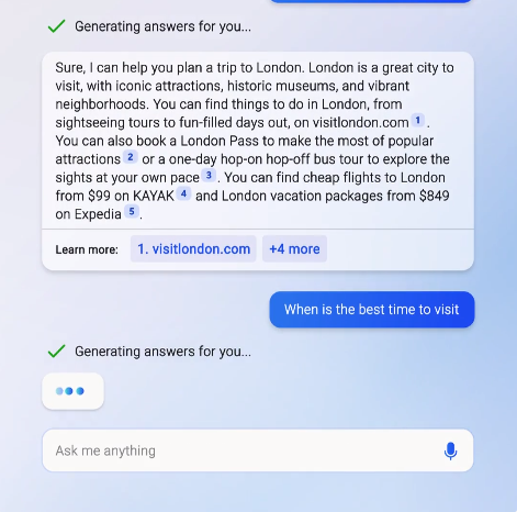 Microsoft Bing은 MS 검색 엔진인데, 최근에는 ChatGPT와 같은 AI 기능이 추가되어 사용자와 대화도 가능해졌습니다. Bing을 통해 정보를 검색하는 동시에, 간단한 질문에도 답변을 받을 수 있습니다. ChatGPT는 최신 정보 검색이 불가능한데, Bing 에서는 검색 결과를 기반으로 답을 제시하기 때문에 최신 정보 대응이 가능합니다.