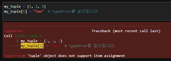 my_tuple = (1, 2, 3) my_tuple[1] = "Two" # TypeError를 일으킵니다.