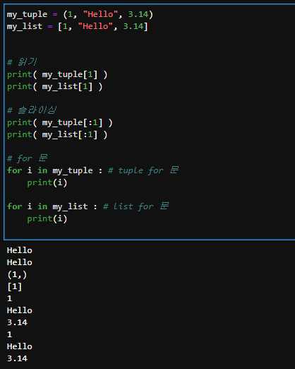 my_tuple = (1, "Hello", 3.14) my_list = [1, "Hello", 3.14] # 읽기 print( my_tuple[1] ) print( my_list[1] ) # 슬라이싱 print( my_tuple[:1] ) print( my_list[:1] ) # for 문 for i in my_tuple : # tuple for 문 print(i) for i in my_list : # list for 문 print(i)
