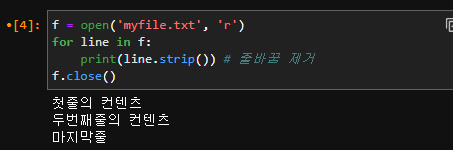 아래와 같이 for 문을 사용하면 파일의 각 줄을 차례로 처리할 수 있습니다.f = open('myfile.txt', 'r') for line in f: print(line.strip()) # 줄바꿈 제거 f.close()