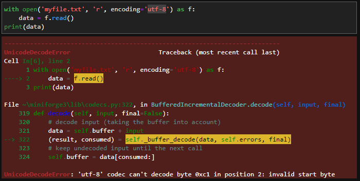 # encoding을 utf-8로 강제 지정합니다. with open('myfile.txt', 'r', encoding='utf-8') as f: data = f.read() print(data)만약 encoding이 안 맞으면 아래와 같이 오류가 발생할 수 있습니다. 이 경우 적절한 인코딩을 찾아 옵션에 입력해야 합니다.