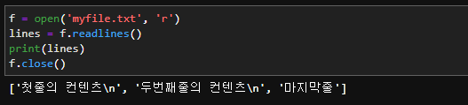 f = open('myfile.txt', 'r') lines = f.readlines() print(lines) f.close()아래가 실행결과 입니다.