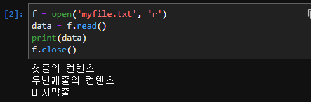 f = open('myfile.txt', 'r') data = f.read() print(data) f.close()아래의 실행결과를 보면 하나의 문자열로 반환됨을 알 수 있습니다.