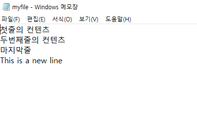 # 'a'옵션을 주어 append 모드로 파일을 엽니다. with open('myfile.txt', 'a') as f: f.write("\nThis is a new line") # 마지막 줄에 추가됩니다.위 코드를 실행하면 myfile.txt 에 새로운 내용("This is a new file")이 추가됨을 확인할 수 있습니다.
