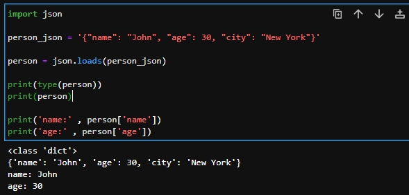 import json person_json = '{"name": "John", "age": 30, "city": "New York"}' person = json.loads(person_json) print(type(person)) print(person) print('name:' , person['name']) print('age:' , person['age'])json.loads로 json 형식의 문자열을 읽으면 python dictionary로 다룰 수 있습니다.