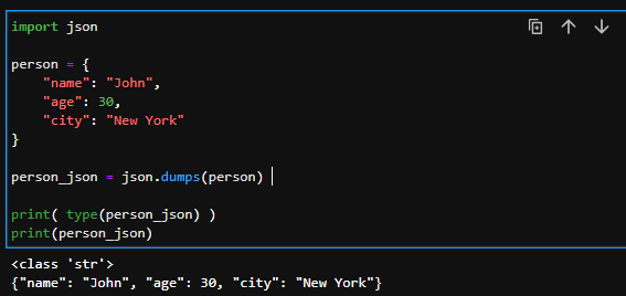 import json # python dict 생성 person = { "name": "John", "age": 30, "city": "New York" } # dict 을 json 문자열로 변환 person_json = json.dumps(person) print(person_json)아래는 실행 결과입니다.