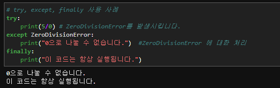 # try, except, finally 사용 사례 try: print(5/0) # ZeroDivisionError를 발생시킵니다. except ZeroDivisionError: print("0으로 나눌 수 없습니다.") #ZeroDivisionError 에 대한 처리 finally: print("이 코드는 항상 실행됩니다.")이 코드를 실행하면, "0으로 나눌 수 없습니다."와 "이 코드는 항상 실행됩니다." 두 메시지가 출력됩니다. 여기서 ZeroDivisionError는 오류의 종류를 의미합니다.