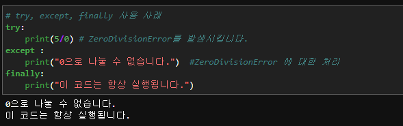 # try, except, finally 사용 사례 try: print(5/0) # ZeroDivisionError를 발생시킵니다. except : print("0으로 나눌 수 없습니다.") #ZeroDivisionError 에 대한 처리 finally: print("이 코드는 항상 실행됩니다.")