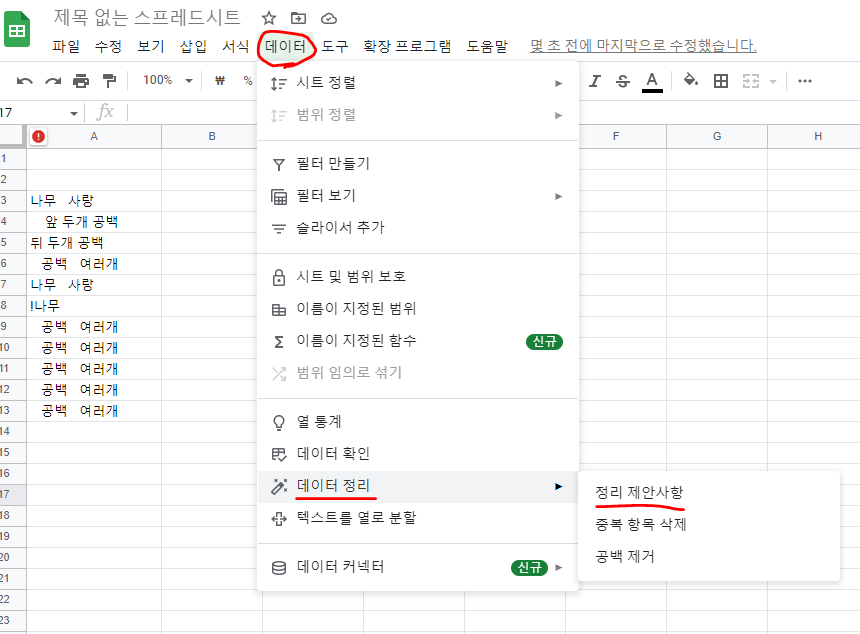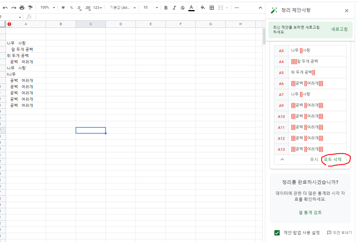 최근에는 같은 메뉴의 "정리 제안사항"으로 자동적으로 중복, 공백을 제거할 수 있습니다.