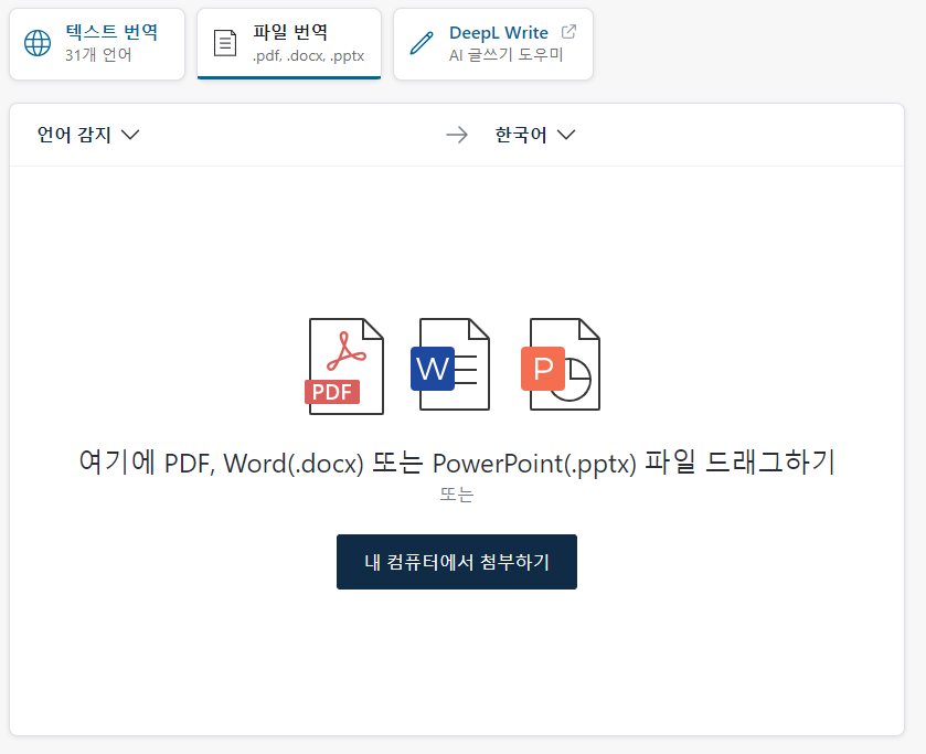DeepL 번역 DeepL은 pdf, docx 같은 파일 번역도 제공하여, 편리하게 이용할 수 있습니다. 다만 무료 버전의 경우 사용횟수나 길이가 제한 될 수 있습니다.