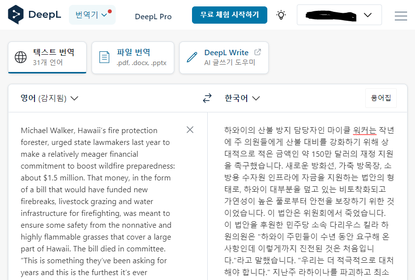 아래 하와이 화재 기사에 대해서 구글, 파파고, DeepL 번역을 해보겠습니다.