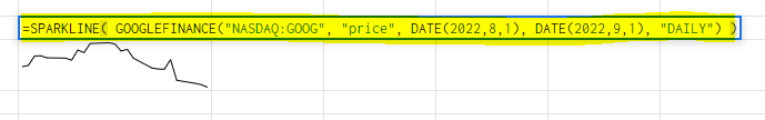 =SPARKLINE( GOOGLEFINANCE("NASDAQ:GOOG", "price", DATE(2022,8,1), DATE(2022,9,1), "DAILY") )아래 이미지와 같이 셀에 그래프가 표시됩니다.
