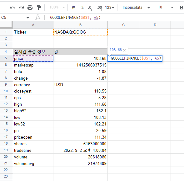 =GOOGLEFINANCE("NASDAQ:GOOG", "PRICE") # --> 108.06현재 구글의 시가 총액을 가져오고 싶다면 아래와 같이 하시면 됩니다.